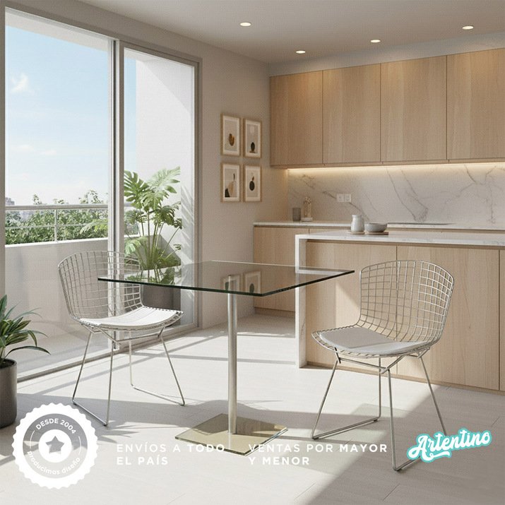MESA CUADRADA CRISTAL 60x60 Cm + 2 SILLAS BERTOIA CROMADAS