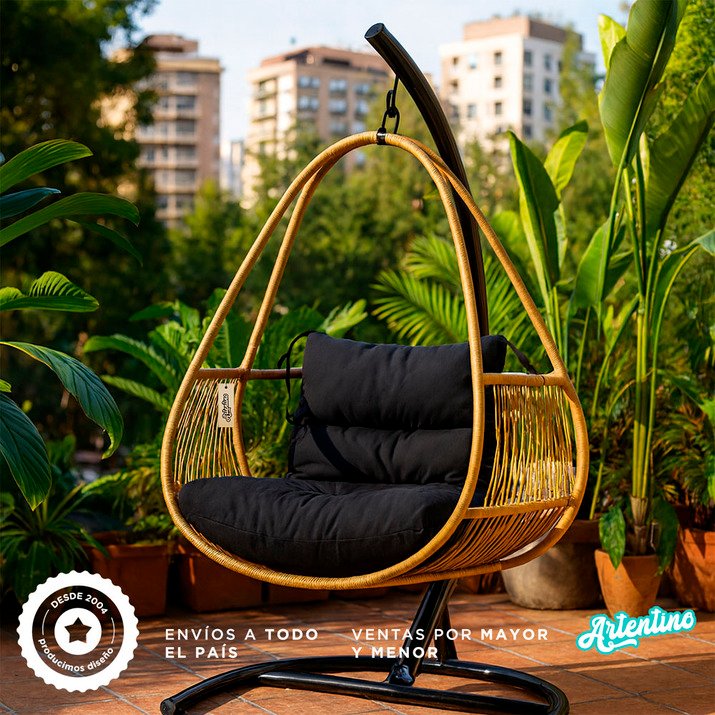 Apta Interior Exterior. Estructura Pintada al Horno Antióxido de Larga Duración. Incluye Almohadón de Regalo Tela Tropical Mecánico Relleno de Goma Espuma. Fácil Armado. Soporta hasta 120Kg. Medidas: Hamaca Alto Total 110cm. Alto Respaldo 44cm. Ancho 84cm. Profundidad 60cm. Base Alto Total 190cm. Ancho 80cm. Largo 96cm.